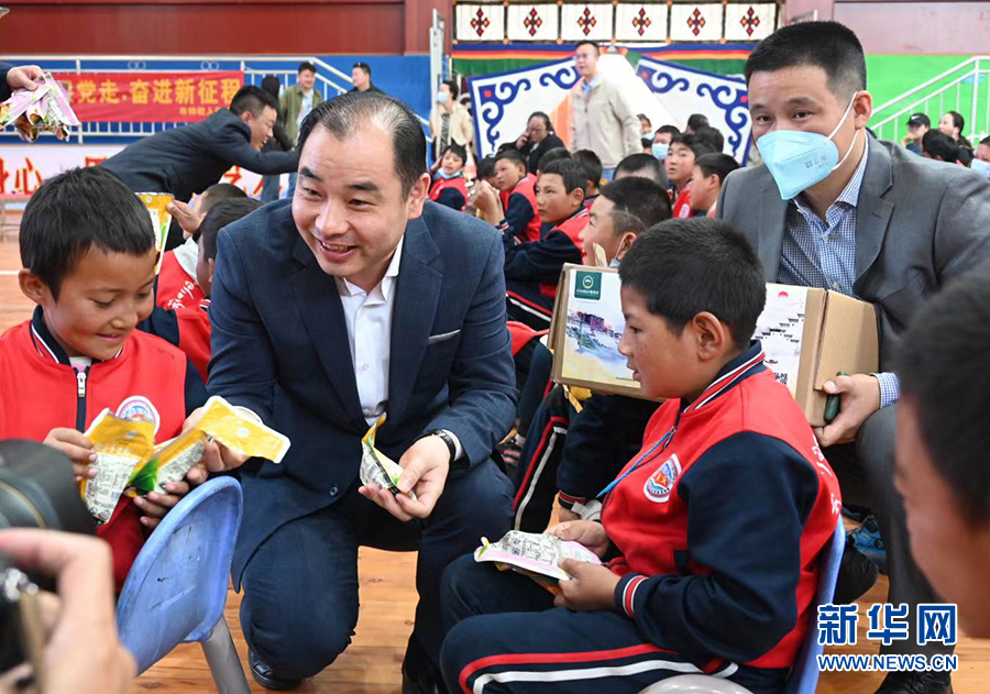 6月3日,在西藏山南市特教學(xué)校,安徽岸香集團董事長黃保鎖為孩子們分發(fā)粽子。新華網(wǎng)發(fā)(許國 攝)
