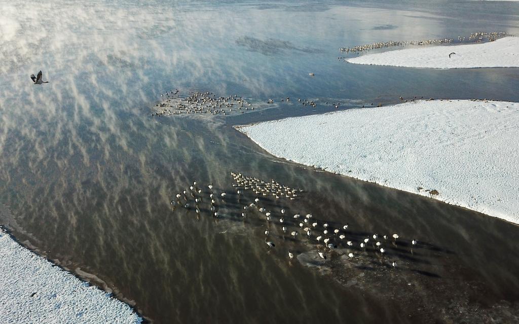 這是在拉薩市林周縣虎頭山水庫(kù)拍攝到的黑頸鶴(2月22日攝,無(wú)人機(jī)照片)。新華社記者 姜帆 攝