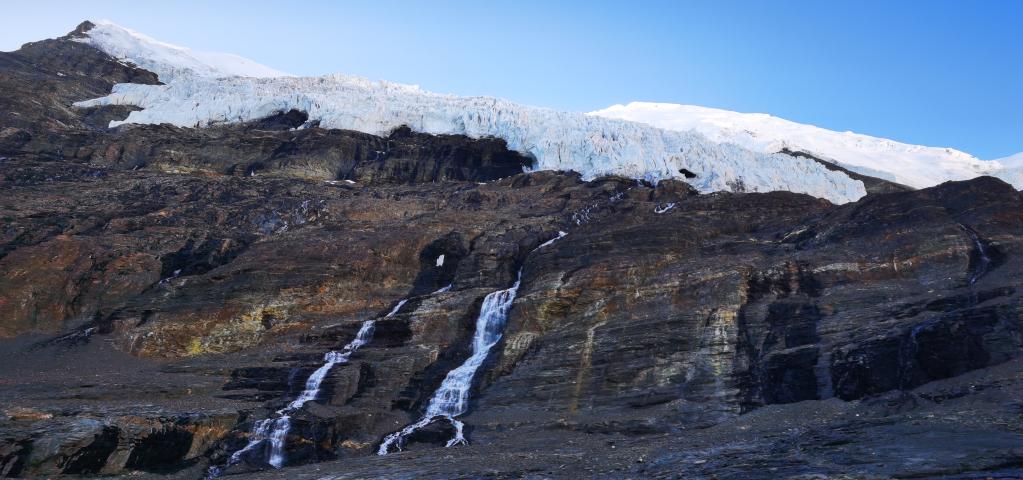 這是位于山南市浪卡子縣的卡若拉冰川,冰川融水形成河流(6月3日攝,無(wú)人機(jī)照片)。新華社記者 沈虹冰 攝