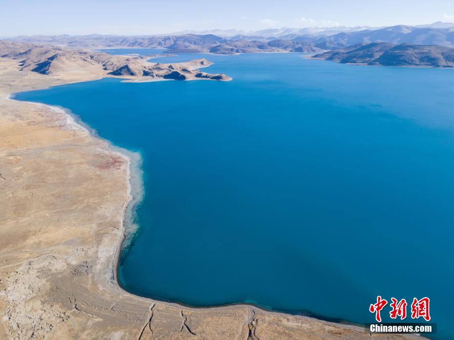 近日,西藏自治區(qū)山南市羊卓雍錯(cuò)(簡(jiǎn)稱(chēng)羊湖),冬日由于沒(méi)有云層遮擋,湖水更顯深藍(lán)、孔雀藍(lán)。航拍視角下,湖水像巨大的寶石鑲嵌于高原大地,風(fēng)光壯麗。羊卓雍錯(cuò)藏語(yǔ)意為“碧玉湖”,湖面海拔4441米,與納木錯(cuò)、瑪旁雍錯(cuò)并稱(chēng)西藏三大“圣湖”。圖為冬日羊湖湖水呈現(xiàn)為“寶石藍(lán)”。 江飛波 攝