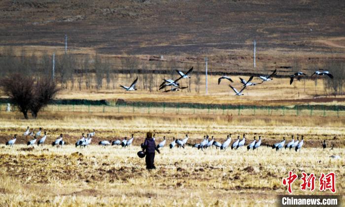 近日,大批黑頸鶴飛臨西藏自治區(qū)拉薩市林周縣越冬。黑頸鶴是國家一級保護(hù)動物。近年來,隨著當(dāng)?shù)厣鷳B(tài)保護(hù)力度越來越大,每年11月前后至次年3月底,來林周縣越冬的候鳥越來越多。