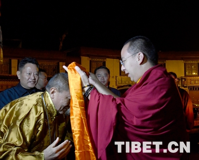 圖為在大昭寺門前,十一世班禪與中國佛協(xié)西藏分會(huì)會(huì)長珠康?土登克珠互獻(xiàn)哈達(dá)。攝影:王媛媛