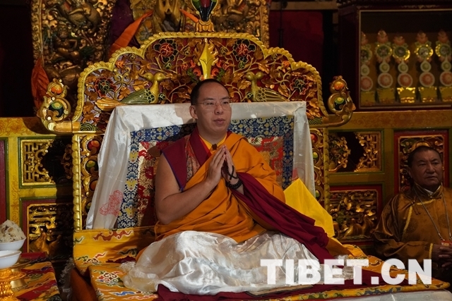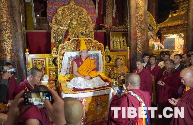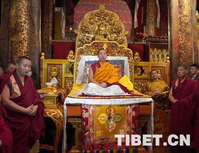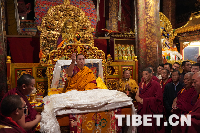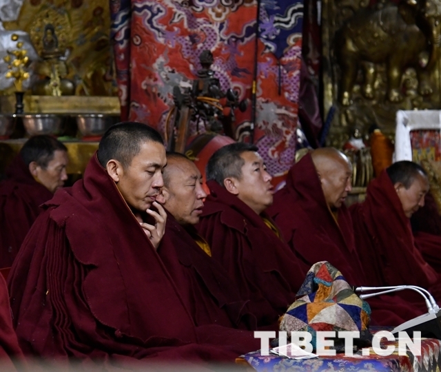 朝拜結(jié)束后,十一世班禪登上設(shè)在釋迦牟尼佛像正對(duì)面的寶座上,面朝佛像,帶領(lǐng)眾僧念誦經(jīng)文,祈愿五谷豐登、國泰民安、世界和平。
