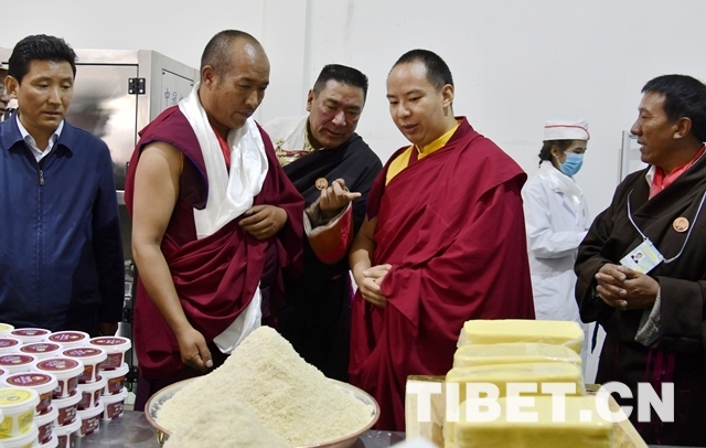 在雪林斯布牧場(chǎng)專業(yè)合作社考察調(diào)研過程中,十一世班禪通過參觀宣傳展板、聽取相關(guān)負(fù)責(zé)人匯報(bào)、參觀乳制品加工廠房等,詳細(xì)了解合作社的生產(chǎn)管理及運(yùn)營(yíng)。每到一處宣傳展板前,十一世班禪都停留片刻,仔細(xì)聆聽相關(guān)負(fù)責(zé)人的介紹,并針對(duì)一些細(xì)節(jié)問題進(jìn)行詳細(xì)詢問。在參觀乳制品加工廠時(shí),十一世班禪對(duì)車間里擺放的酥油筒產(chǎn)生了濃厚的興趣,饒有興致地手握長(zhǎng)柄活塞,打起了酥油。看到乳制品加工廠里生產(chǎn)出的牦牛奶渣、酥油和酸奶,十一世班禪還品嘗了奶渣。