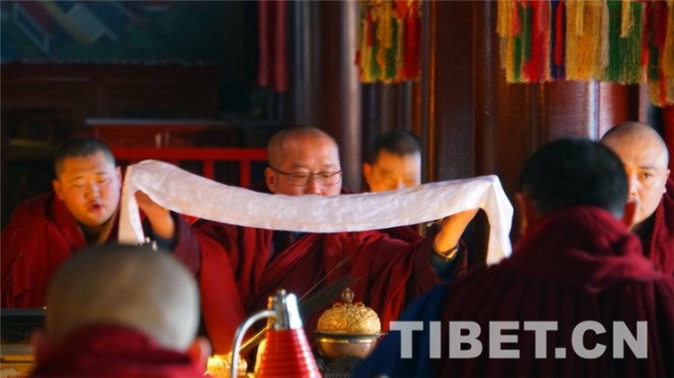 圖為僧人端坐于宗喀巴大師像兩側(cè)誦經(jīng)。