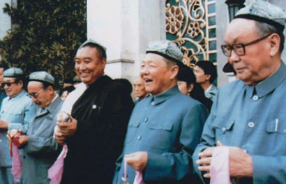 圖為習(xí)仲勛(左一)、十世班禪(中)、鄧穎超(右一)、參加中國藏語系高級(jí)佛學(xué)院成立大會(huì)。圖片來源:人民日?qǐng)?bào)