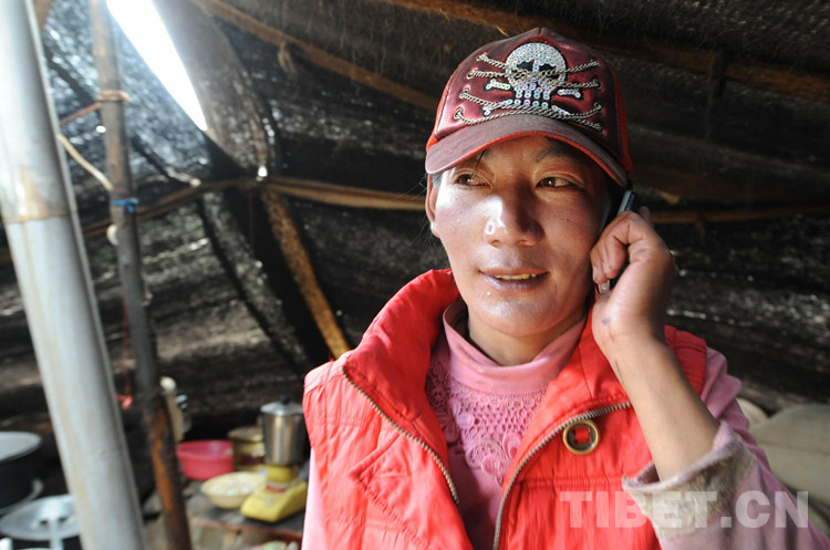 圖為嘎措鄉(xiāng)牧女頓珠卓瑪在夏季放牧點(diǎn)的帳篷里使用手機(jī)與家人通話報平安(2009年8月1日) 攝影:唐召明