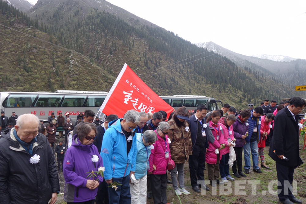 圖為十八軍老戰(zhàn)士和十八軍后代們?cè)谑塑娺M(jìn)藏的無名女兵墓前敬獻(xiàn)花籃并默哀