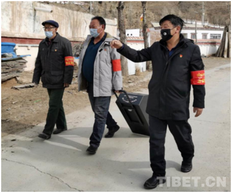 代格村黨支部書記格來達杰直人快語,他說:“組織上交給我們的任務就是把本村的群眾保護好,禁止外來人員進入。我們村的全體村民對防控疫情工作全力支持配合。全村除6人因病重、喪事外,無一人出村。大家都自覺停止了探親訪友、聚會、轉經(jīng)和串門?!备駚聿湃式榻B:“代格村設有4個卡點,2個固定卡子和2個流動卡子。固定卡子實行24小時值守,任務是對外來人員進行勸返和本村人員進入時的消毒工作。負責流動卡子人員在村內拉著多功能音響設備進行‘小喇叭’宣傳和消毒工作。