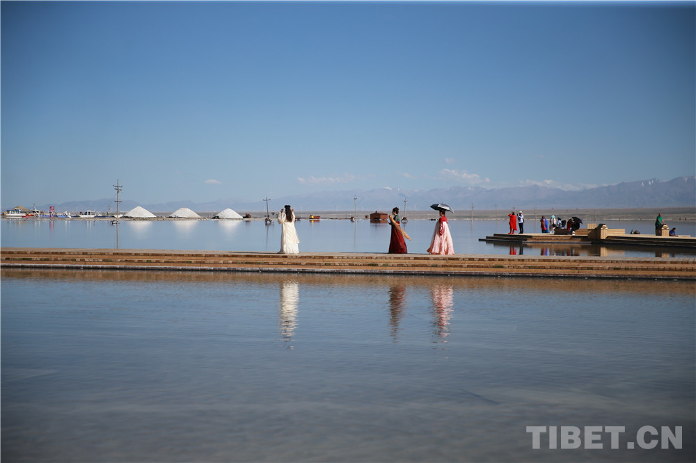 圖為游客正在拍攝,紅色是茶卡鹽湖景區(qū)里最醒目的顏色 攝影:楊月云