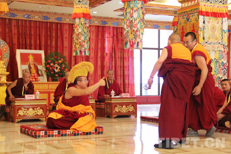 被主考官點(diǎn)名上場的考僧,身披黃色法衣,結(jié)跏趺坐于考場正中佛墊,屏氣凝神。提問辯經(jīng)人員用“諦……”聲提示“舌戰(zhàn)”開始,并在考場上來回走動間口若懸河、滔滔不絕,即興向考僧提問。提問過程中,辯經(jīng)人員常會借助各種手勢來增強(qiáng)辯論的力度。如右手甩念珠,快速跨步向前,高舉右手,用力擊掌,聲如裂石,令人振奮??忌仨毤芯?,意志堅(jiān)定,沉著應(yīng)戰(zhàn)。不得不說,雙方常會言辭激烈,爭辯得面紅耳赤,這種情況下,仍能夠從容不迫、應(yīng)答得體的佼佼者才能得到認(rèn)可,脫穎而出。