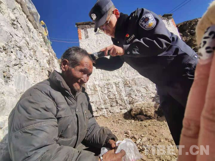 圖為達瓦次仁為為彭措林那嘎村孤寡老人剪頭發(fā)
