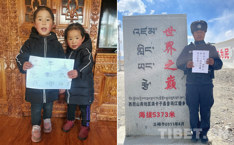 這是一張拼版照片,姐姐洛桑卓瑪,今年5歲,妹妹益西卓嘎,今年3歲。她們的父母——洛桑曲扎和索郎卓瑪,一個(gè)是浪卡子縣普瑪江塘鄉(xiāng)的移民管理警察,一個(gè)是山南市的特警,夫妻倆已經(jīng)三年沒有在家陪兩個(gè)女兒過年了。春節(jié)將至,洛桑曲扎堅(jiān)守在全國(guó)海拔最高的普瑪江塘邊境派出所,守護(hù)邊境,保衛(wèi)祖國(guó)。