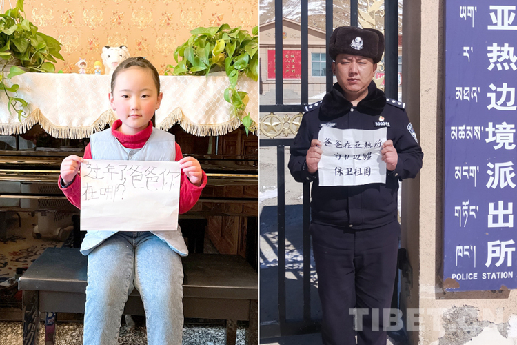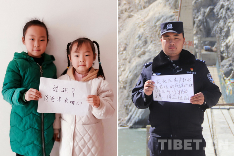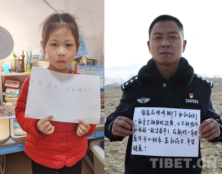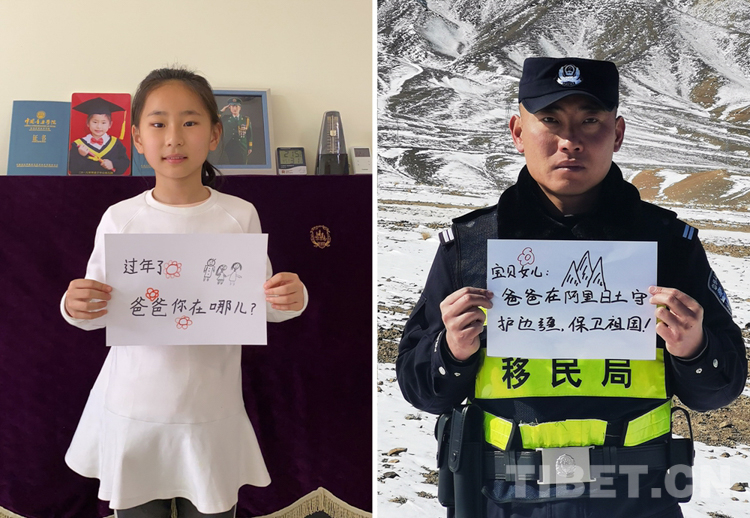 這是一張拼版照片,小女孩名叫旦增諾央,今年8歲,到現(xiàn)在還沒有和爸爸一起過過年。爸爸旦增尼瑪是日喀則邊境管理支隊(duì)亞熱邊境派出所所長(zhǎng),春節(jié)將至,他和戰(zhàn)友們堅(jiān)守在海拔5300多米的中尼邊境一線,他通過這種方式表達(dá)對(duì)孩子的思念,相信慢慢長(zhǎng)大的孩子一定能夠理解自己。