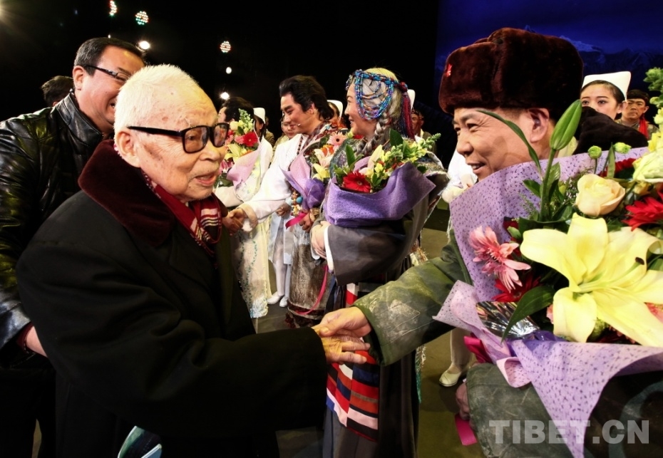 圖為北京建藏援藏工作者協(xié)會學習指導(dǎo)老師陰法唐將軍在中國評劇院所創(chuàng)作的評劇《藏地彩虹》試演結(jié)束后,上臺握手祝賀(唐召明2017年12月10日攝)