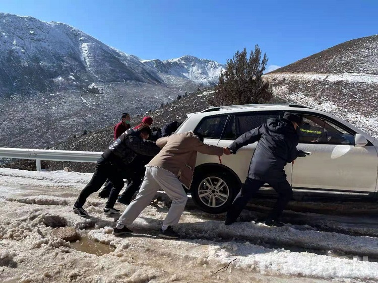 面對焦急萬分的父親,為了讓病中的孩子第一時(shí)間得到醫(yī)治,根秋降澤立即下車施救。由于鄉(xiāng)村道路路況較差,加之冰雪覆蓋,車輛打滑嚴(yán)重,施救過程十分艱難。根秋降澤憑借多年應(yīng)對冰雪路況的駕駛經(jīng)驗(yàn),組織大家在極度嚴(yán)寒、工具缺乏的情況下,通過刨冰除雪、手推車?yán)姆绞?,?jīng)過半個(gè)多小時(shí)的努力終于讓被困車輛擺脫困境。根秋降澤捂著凍僵的手,一再提醒駕駛員要常備防滑鏈條,在冰雪路段需小心謹(jǐn)慎駕駛,切勿急打方向等注意事項(xiàng)。