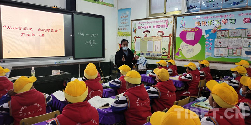 圖為山南市曲松縣邱多江鄉(xiāng)小學(xué)開展“從小學(xué)黨史 永遠(yuǎn)跟黨走”開學(xué)第一課活動