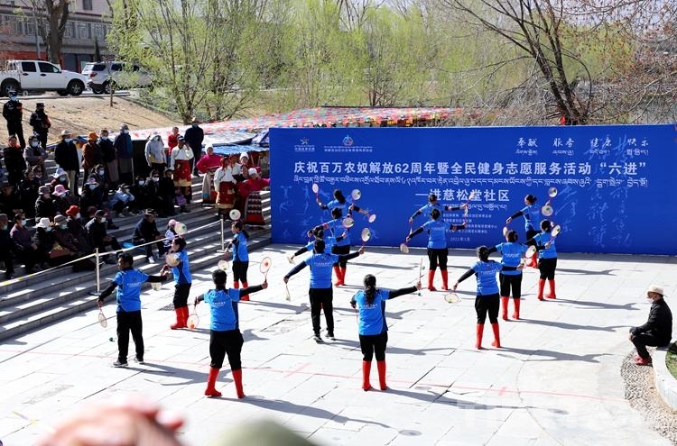 中國西藏網(wǎng)訊 3月27日,為慶祝西藏百萬農(nóng)奴解放62周年,進一步貫徹落實全民健身國家戰(zhàn)略,由西藏自治區(qū)體育局、西藏自治區(qū)體育總會、慈松塘社區(qū)黨支部主辦的慶祝百萬農(nóng)奴解放62周年暨全民健身志愿服務(wù)“六進”活動走進慈松塘社區(qū)。