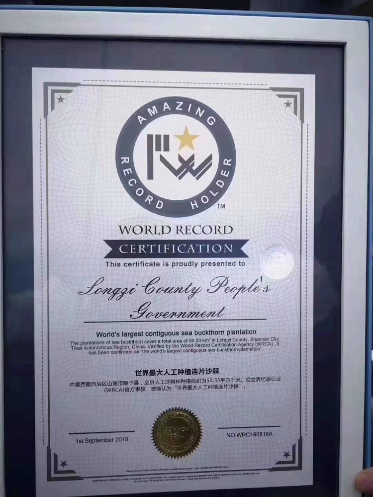 圖為2019年9月1日,山南市隆子縣的沙棘林被世界紀錄認證機構(WRCA)認證為“世界最大人工種植連片沙棘”