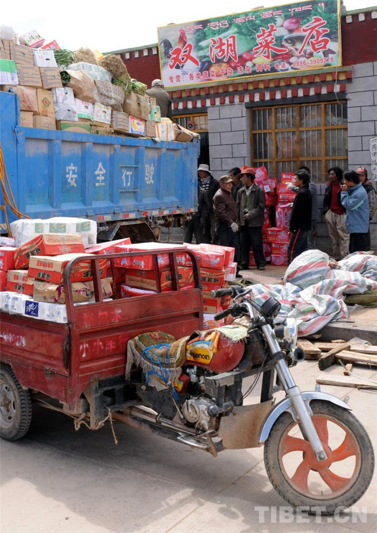 這是雙湖特別區(qū)(現(xiàn)為雙湖縣)的“雙湖菜店”正在準(zhǔn)備把包車運(yùn)來(lái)的蔬菜等物品卸貨(唐召明2009年8月攝)