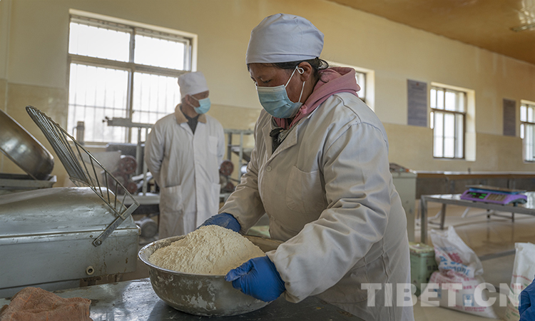 產(chǎn)品加工車間內(nèi),格桑南珠正在和高薪聘請(qǐng)的老師陳周祥一起加工糌粑餅干?!拔以谶@里工作快一年了,在老師的帶領(lǐng)下基本上能獨(dú)立完成糌粑餅干的加工生產(chǎn)了。這里工作一天有170元錢,比在家務(wù)農(nóng)的收入高多了?!?0歲的格桑南珠笑著說(shuō)。