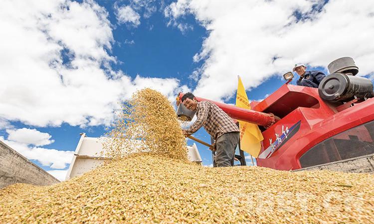 圖為日喀則市江孜縣青稞機械化收割現(xiàn)場 攝影:趙耀