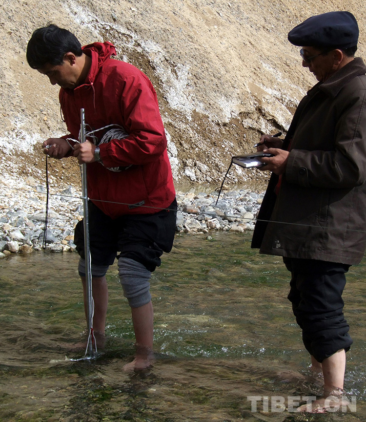 這是時(shí)任雙湖特別區(qū)副區(qū)長王暉(左)和區(qū)委書記珠巨(右)在測(cè)量建設(shè)中的水電站流速(王暉提供,2007年攝)