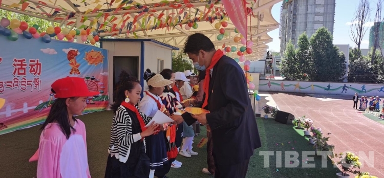 圖為西藏自治區(qū)拉薩市城關區(qū)納金小學“童心向黨、做時代新人”六一兒童節(jié)活動現(xiàn)場為優(yōu)秀學生頒獎
