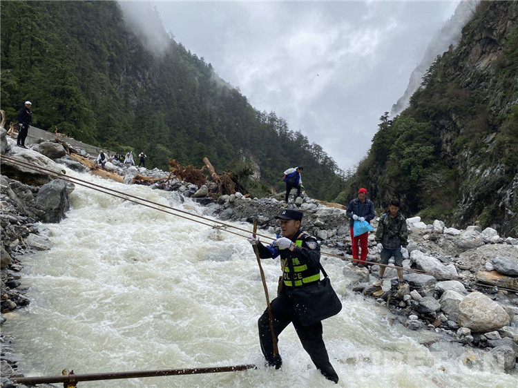 在經過勘察后,派出所民警發(fā)現左布德至國防公路四號橋位置發(fā)生大面積山體滑坡10余處,救援隊研判搜救風險后,通過搭橋、吊繩、分批護送等方式打通了長達10公里的“生命通道”。