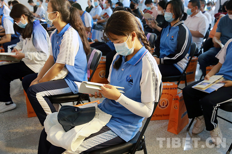 圖為6月29日的開幕式上,來(lái)自北京西藏中學(xué)的學(xué)生翻閱展覽資訊 攝影:楊月云