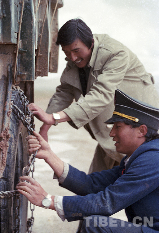 這是郵政人員正在為郵車的輪胎綁防滑鏈條,以便郵車順利通過(guò)泥濘路。上世紀(jì)七八十年代,由于藏北西部交通不便,每半月通郵一次的郵車常常會(huì)在草原上遭遇陷車等困難(唐召明1987年攝)