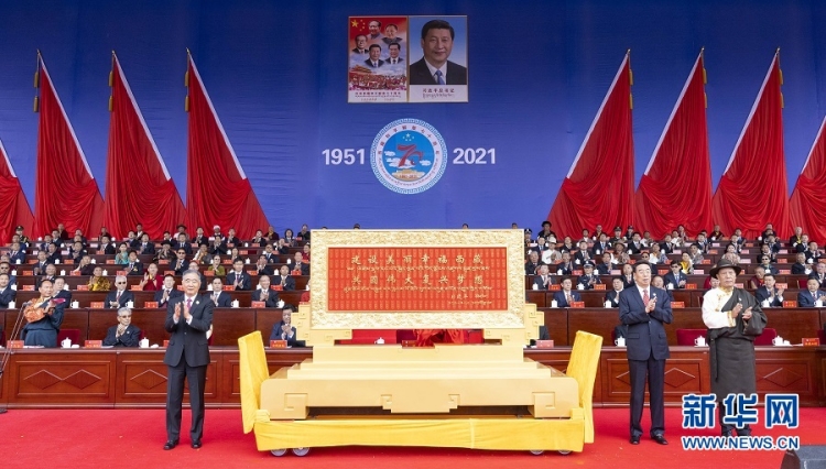 2021年8月19日,西藏自治區(qū)和平解放70周年。中共中央政治局常委、全國政協(xié)主席、中央代表團團長汪洋向西藏自治區(qū)贈送了中共中央總書記、國家主席、中央軍委主席習近平題詞的“建設美麗幸福西藏 共圓偉大復興夢想”賀匾等紀念品。