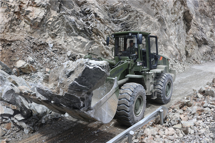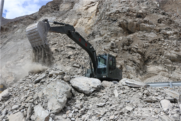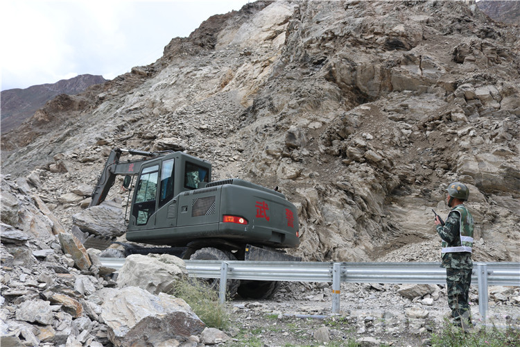 抵達現(xiàn)場后,武警官兵及時對災害路段實施交通管制,并把滯留車輛疏導至安全區(qū)域,隨即對泥石流堆積物和塌方體進行清理。因災害點處于峽谷地帶,地勢十分險要,作業(yè)面狹窄,且降雨及落石持續(xù)不斷,為確保搶通工作高效安全,指揮員科學指揮,安全員高度警惕,操作手快速搶通,各要素密切配合,給道路搶通工作爭取了寶貴時間。