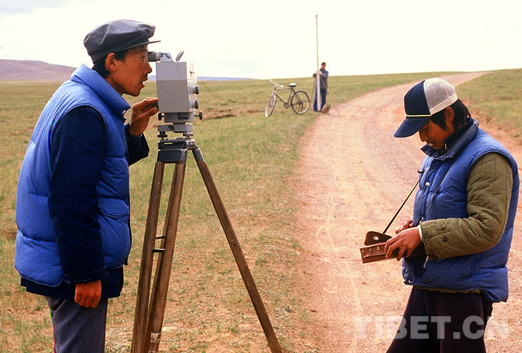 這是國家測繪局第一大地測量隊(duì)技術(shù)人員在進(jìn)行大地水準(zhǔn)測量(唐召明1987年攝)