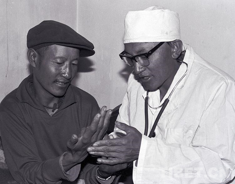 這是文部辦事處(現(xiàn)尼瑪縣)衛(wèi)生院院長(zhǎng)羅桑多吉正在為牧民患者診治疾病(唐召明1987年攝)