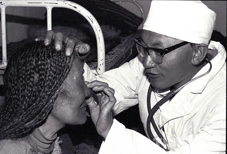這是文部辦事處(現(xiàn)尼瑪縣)衛(wèi)生院院長(zhǎng)羅桑多吉正在為住院牧民患者診治眼睛疾病(唐召明1987年攝)