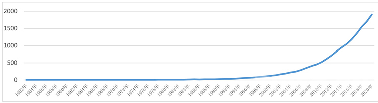 圖為1951—2021年上半年地區(qū)生產(chǎn)總值走勢(億元)