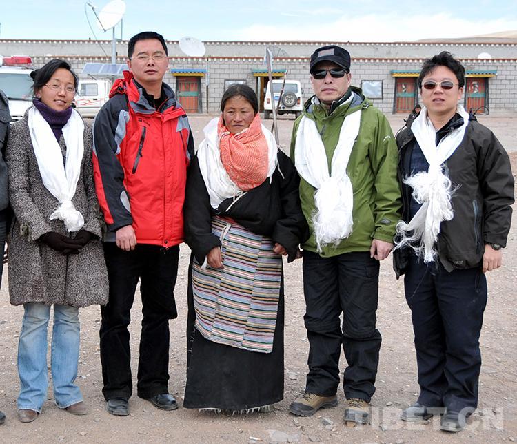圖為中國(guó)石化第五批援藏干部、班戈縣副書(shū)記陳志清(左二)和常務(wù)副縣長(zhǎng)潘峰(右一)專程到班戈縣新吉鄉(xiāng)接脖子下長(zhǎng)著巨大腫瘤的牧女斯求卓瑪進(jìn)京治病時(shí),在鄉(xiāng)政府一同合影留念(王普2010年3月26日攝)