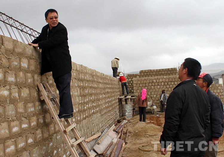 圖為中國(guó)石化第五批援藏干部、班戈縣常務(wù)副縣長(zhǎng)潘峰(左)和副書(shū)記陳志清(右)在班戈縣鄉(xiāng)下檢查牧民定居房的施工情況(唐召明2011年6月25日攝)