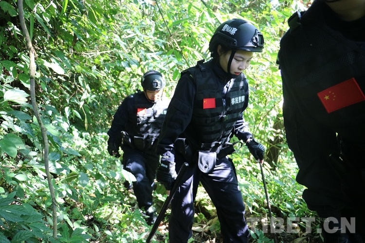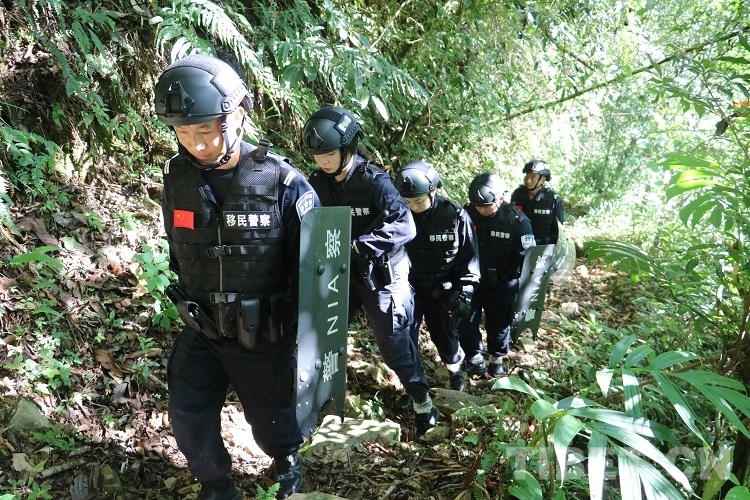 走在隊伍最前面的是經(jīng)驗豐富的老民警李永杰,他手里拿著一把砍刀,一邊清理小路兩側(cè)蔓延出來的枝椏,一邊時刻注意著兩位女民警情況。隨著海拔升高,走進(jìn)樹木茂盛的叢林,陽光只能從郁郁蔥蔥的樹葉間撒下兩三縷光芒,兩名女民警瞪大眼睛好奇地觀察著周圍,對接下來的行程充滿期待。