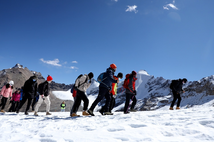 楊女士進(jìn)藏已有半月,在專業(yè)人士的協(xié)助下她第一次近距離接觸了冰雪世界,并攀登到了海拔5600米的地方。“今天我沒有高原反應(yīng),帶的氧氣也沒用?!痹谘┥缴蠗钆康呐d奮之情溢于言表。