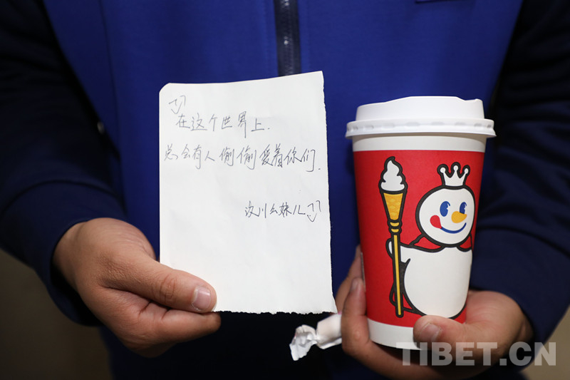 抱著這個(gè)還有溫度的大箱子,楊文武趕緊報(bào)告了指導(dǎo)員楊路路。打開箱子后,發(fā)現(xiàn)是整整齊齊60杯熱騰騰的奶茶。茶杯上留著一張小紙條,寫著“在這個(gè)世界上,總會(huì)有人偷偷愛著你們”,落款人“汶川幺妹兒”。指導(dǎo)員和楊文武恍然大悟,肯定是一位熱心的女孩匿名買了奶茶,又讓這對(duì)外賣夫婦送過來的。只是不知道是哪位暖心的女孩送了奶茶,因?yàn)闆]有留下任何聯(lián)系方式,也沒有透露自己的真實(shí)姓名。