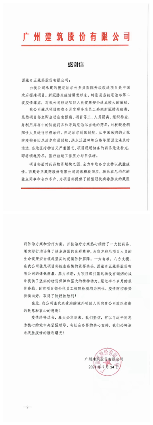 患者經(jīng)多次核酸檢測(cè)轉(zhuǎn)陰未復(fù)陽(yáng)后,廣州建筑集團(tuán)特地給西藏奇正藏藥股份有限公司寫了一份感謝信,信中寫到:西藏奇正藏藥股份有限公司為項(xiàng)目部提供了新型冠狀病毒肺炎的藏醫(yī)藥防治方案和治療方案,并按治療方案熱心捐贈(zèng)了一大批藥品,用實(shí)際行動(dòng)詮釋了扶危濟(jì)困的光彩精神,為我方駐尼項(xiàng)目人員的生命健康安全筑起堅(jiān)實(shí)的疫情防護(hù)屏障。一方有難,八方支援,在我公司駐尼項(xiàng)目部抗擊疫情的緊要關(guān)頭,西藏奇正藏藥股份有限公司的慷慨解囊、鼎力相助,為項(xiàng)目部打贏這場(chǎng)沒有硝煙的戰(zhàn)爭(zhēng)提供了堅(jiān)實(shí)的物資保障和強(qiáng)大的精神動(dòng)力。