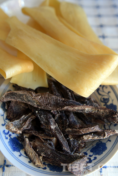 而“啦啦”,則是一種藏式奶酪,是一種高品質(zhì)奶制品?!袄怖病币话阌米髡写腿耍彩遣乇狈昴赀^節(jié)時(shí)的主要食品之一。這種用牦牛奶經(jīng)凝固而成的食物,基本上排除了牛奶中大量的水分,保留了其中營養(yǎng)價(jià)值極高的精華部分,被譽(yù)為乳品中的“黃金”。它味道香甜、乳香濃郁,很受人們喜愛,常泡在酥油茶中食用或出遠(yuǎn)門當(dāng)干糧,既解渴又充饑。
