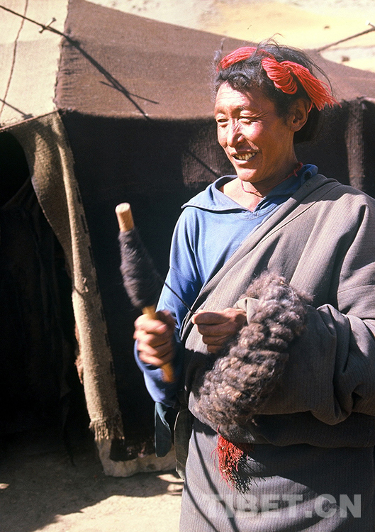 這是一名牧民男子在家中帳篷前捻用來織帳篷的牦牛線。過去牧民逐水草而居,住的是可以隨時(shí)拆遷的牛毛帳篷。如今,大多數(shù)牧民已住進(jìn)寬敞明亮的安居房,已很少自己捻毛線來織帳篷了(唐召明1987年攝)