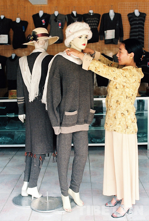 這是那曲地區(qū)(現(xiàn)那曲市)班戈縣絨毛分梳廠拉薩門市部經(jīng)理阿吉姆正在整理所經(jīng)銷的牦牛絨衫。由于牦牛絨衫相對于羊絨衫價(jià)格低、質(zhì)量好,在拉薩市場很受人們歡迎(唐召明1997年攝)
