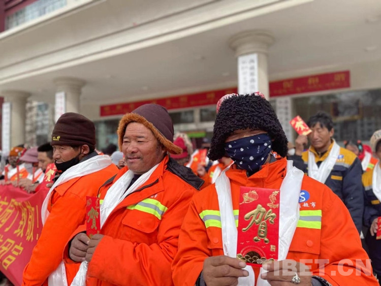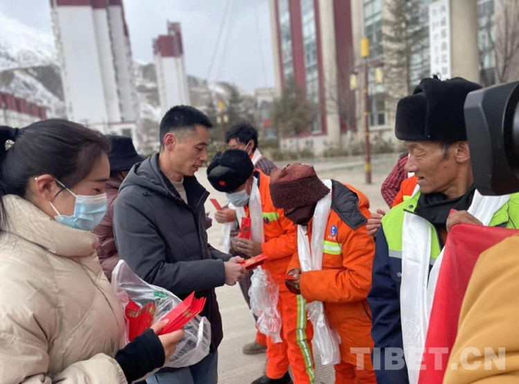 中國西藏網(wǎng)訊 2月28日,在藏歷新年到來之際,西藏自治區(qū)那曲市比如縣政府大樓前正在開展一場(chǎng)溫暖人心的慰問活動(dòng)。“新年好,給大家拜年了,衷心祝愿大家在新的一年里身體健康、工作順利?!?慰問現(xiàn)場(chǎng),川英集團(tuán)負(fù)責(zé)人向每位環(huán)衛(wèi)工人和城管協(xié)管員獻(xiàn)上潔白的哈達(dá)致以新年的美好祝福,感謝他們?yōu)楸热绛h(huán)衛(wèi)事業(yè)作出的貢獻(xiàn),并送上1000元慰問金。(中國西藏網(wǎng) 記者/賈華加 比如縣宣傳部供圖)