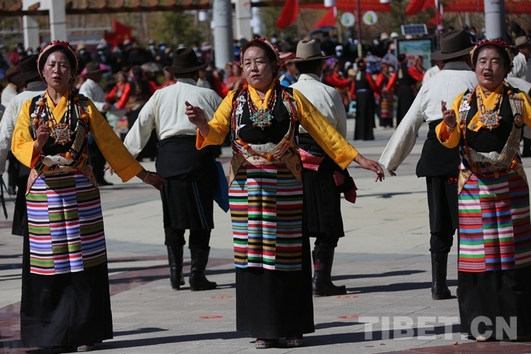 文藝演出結(jié)束后,現(xiàn)場響起歡快的鍋莊舞曲,400余名日喀則各族群眾跳起鍋莊,以這種大聯(lián)歡的形式,共同慶祝63年前擺脫苦難、重獲新生,以及今天的幸福生活。