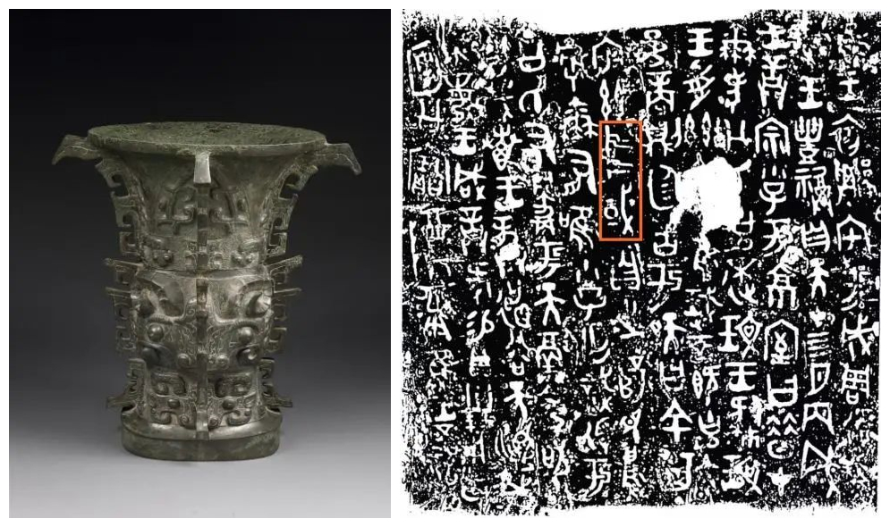 圖左為出土于陜西寶雞的西周早期青銅器、中國首批禁止出國(境)展覽文物、國家一級(jí)文物——何尊;圖右為何尊內(nèi)底鑄銘文“中國”一詞。這是“中國”一詞最早的出土見證。 圖片來源:寶雞青銅器博物院