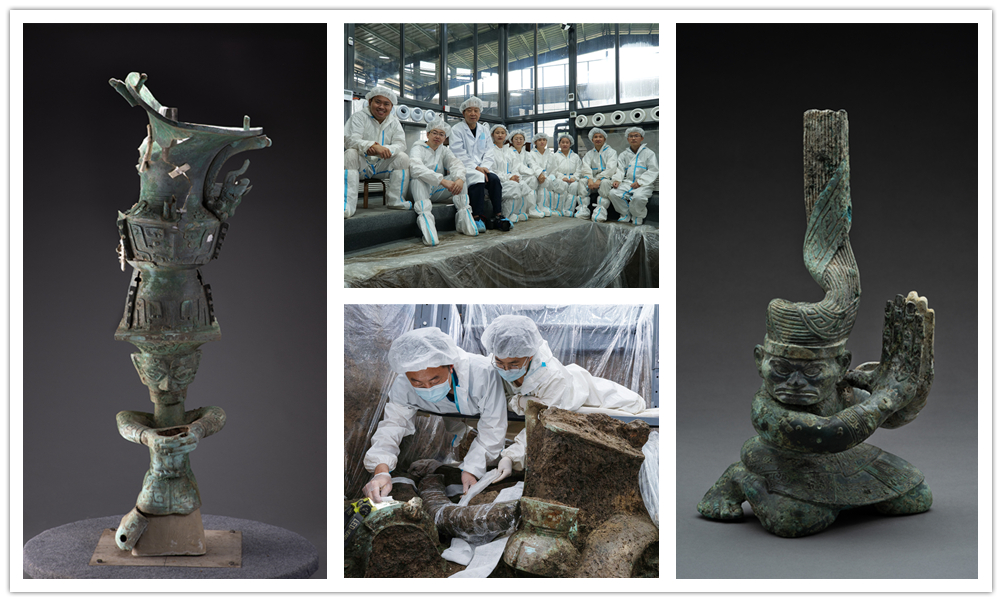 圖左為三星堆遺址三號(hào)坑出土銅頂尊跪坐人像;圖中上為部分發(fā)掘人員合影;圖中下為象牙保護(hù)與提??;圖右為三星堆遺址四號(hào)坑出土扭頭跪坐銅人像 圖片來源:國家文物局